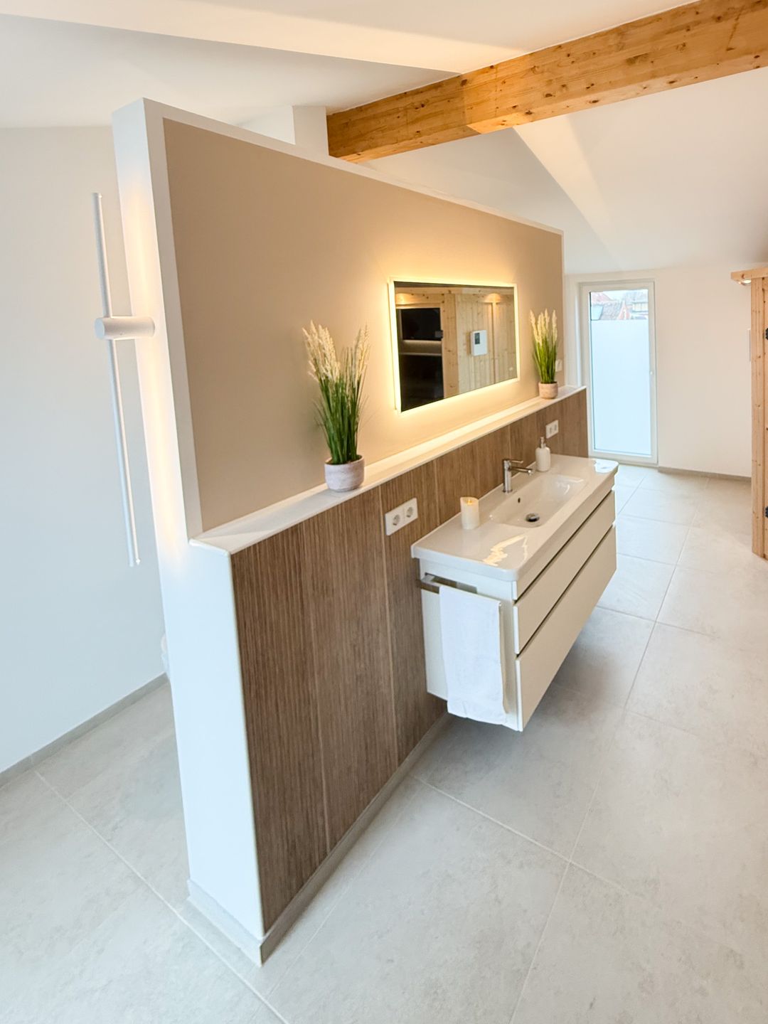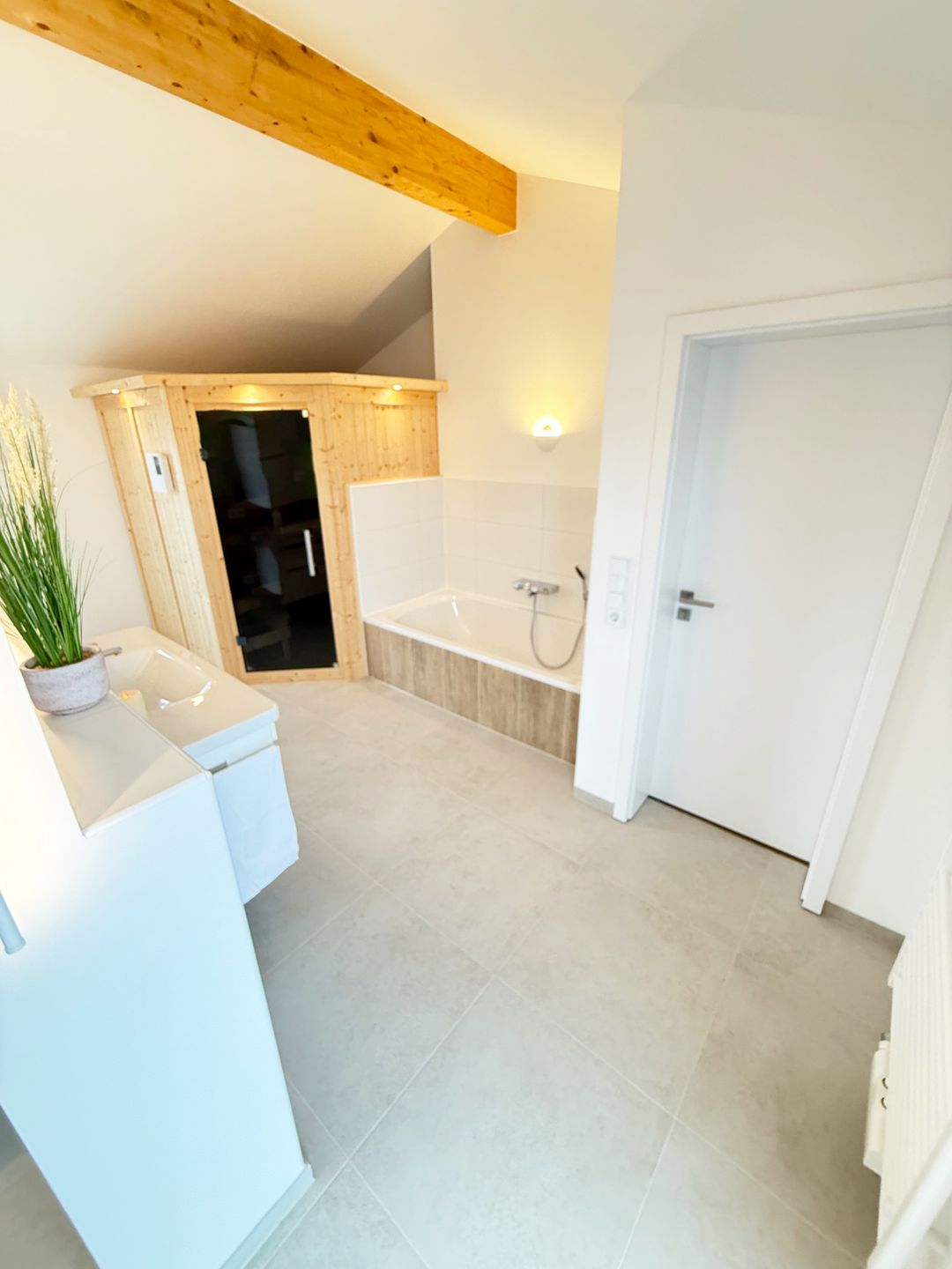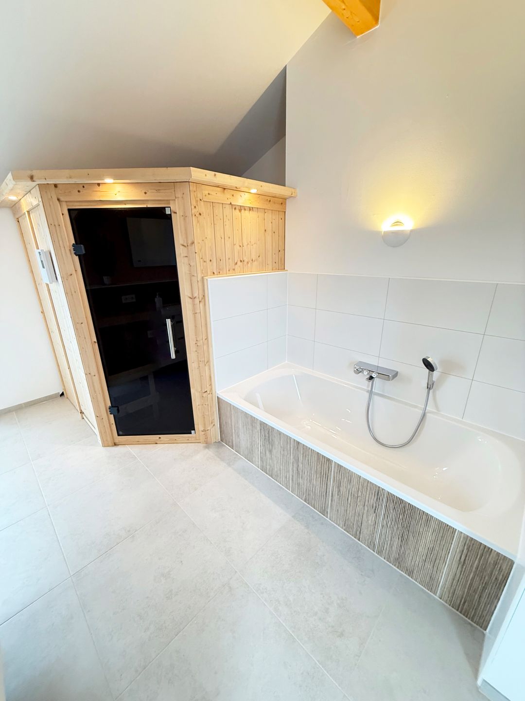 dieses Wellnessbadezimmer mit der integrierten und geräumige Sauna. Nach einem